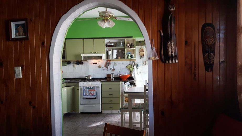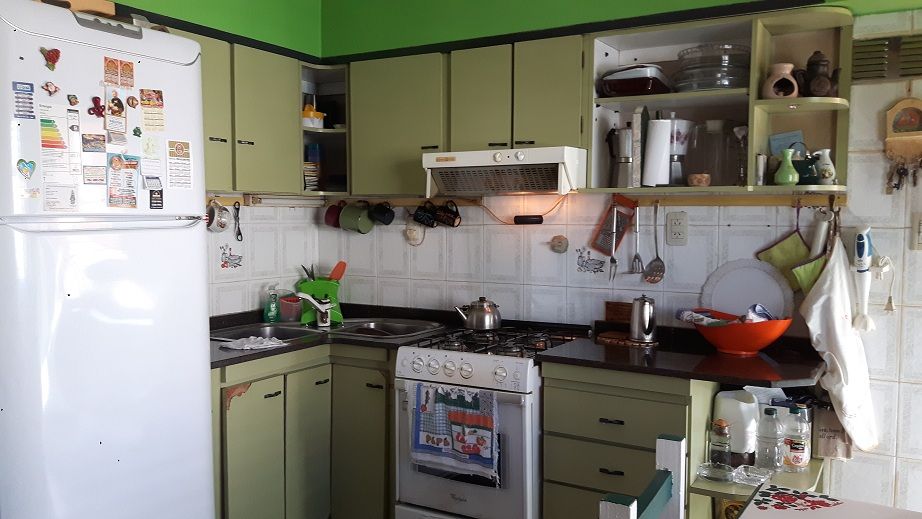 Cocina-comedor con piso y pared ceramicado, con mesada de granito, bajo mueble y alacena en melamina.
