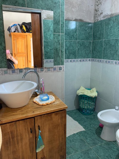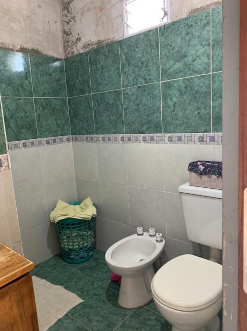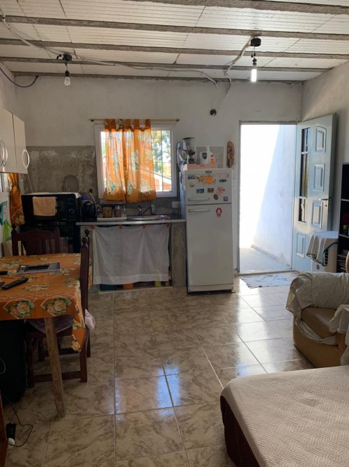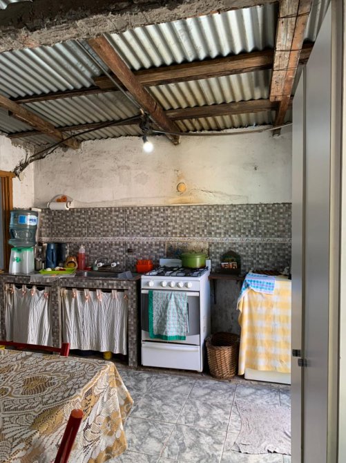 Casa con entrada de auto para dos o tres vehículos; living-comedor con piso cerámico; cocina-comedor con mesada, pared ceramicada y termotanque (sin amueblamiento y falta revestir); dos dormitorios con piso cerámico y techo de losa; un baño ceramicado completo con inodoro, bidet, vanitory de madera y ducha; patio atrás con pileta de lavar.
