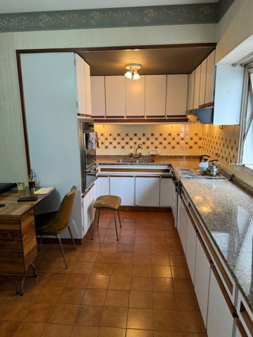 - Departamento al Frente con living-comedor con alfombra, hogar y balcón a la calle; cuatro dormitorios con alfombra y placard empotrado; tres baños ceramicados completo con inodoro, bidet, lavamanos y ducha; una cocina amplia con pisos y paredes revestidas en cerámico con mesada de granito, bajo mueble y alacena de formica; lavadero independiente; una habitación de servicio; ingreso de servicio por segundo ascensor.
